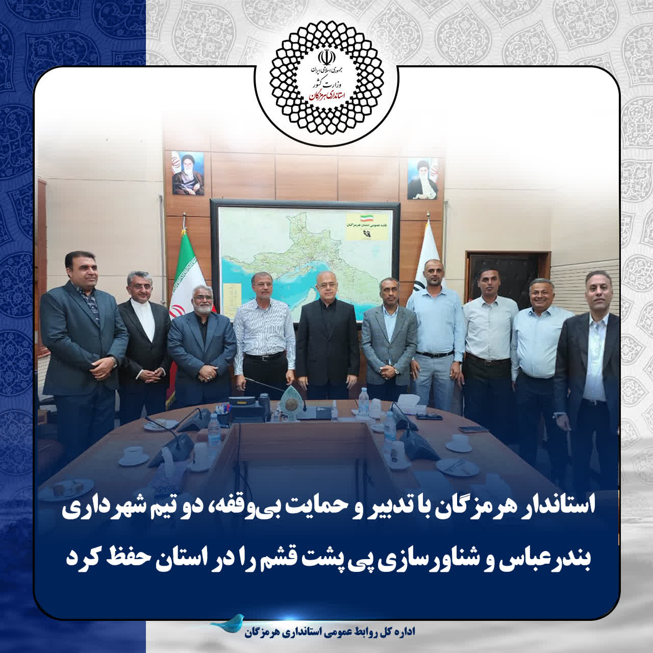 در جلسات متعددی که با حضور مسئولان استانی و نمایندگان مردم به ابتکار استاندار هرمزگان تشکیل شد، راهکارهای حفظ تیمهای شهرداری بندرعباس و شناورسازی پیپشت قشم بررسی و اجرایی شد. احیای تیم شهرداری بندرعباس با پیگیری استاندار، نمایندگان و مسئولین استان پس از پیگیریهای مستمر دکتر آشوری ، جلسات متعدد و فوق العاده با اعضای شورای شهر، تیم شهرداری بندرعباس با مصوبه جدید به فعالیت خود ادامه داد. این تصمیم نشاندهنده اهمیت توسعه ورزش حرفهای و حفظ هویت ورزشی استان بود. حفظ امتیاز شناورسازی پیپشت قشم؛ افتخاری برای هرمزگان تیم شناورسازی پیپشت قشم، به عنوان تنها تیم روستایی کشور که به لیگ دسته یک صعود کرده، با چالشهای مالی و زیرساختی فراوان روبهرو بود. استاندار هرمزگان با تأکید بر حفظ امتیاز این تیم در استان، گفت: شناورسازی پیپشت یک افتخار برای هرمزگان است و اجازه نمیدهیم امتیاز آن از استان خارج شود. با جذب اسپانسر و حمایت های مالی، بازیهای این تیم در بندرعباس برگزار خواهد شد. وی با تأکید بر اهمیت تسریع در اجرای پروژهها، توسعه و بهروزرسانی اماکن ورزشی این امر را گامی اساسی در مسیر رشد ورزش استان و فراهمآوردن محیطی ایمن و استاندارد برای ورزشکاران و علاقهمندان دانست. توسعه ورزش، محور توسعه پایدار هرمزگان اقدامات اخیر دکتر محمد آشوری تازیانی، استاندار هرمزگان، در حفظ و حمایت از تیمهای شهرداری بندرعباس و شناورسازی پیپشت قشم نشاندهنده نگاه راهبردی ایشان به ورزش به عنوان یکی از ارکان اصلی توسعه پایدار در استان است. استاندار هرمزگان با تأکید بر اینکه ورزش تنها یک فعالیت تفریحی نیست، بلکه عاملی برای انسجام اجتماعی، اشتغالزایی و معرفی ظرفیتهای استان است، از هیچ تلاشی برای حفظ این دو تیم مهم دریغ نکرد.