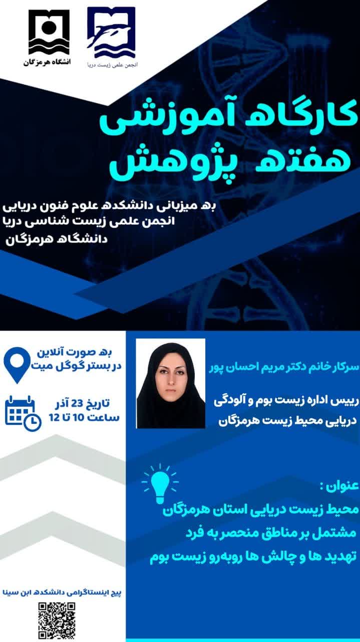 کارگاه آموزشی تخصصی به مناسبت هفته پژوهش، با محوریت بررسی محیطزیست دریایی استان هرمزگان، به میزبانی دانشکده علوم و فنون دریایی و با همکاری انجمن علمی زیستشناسی دریا دانشگاههای استان هرمزگان برگزار شد.